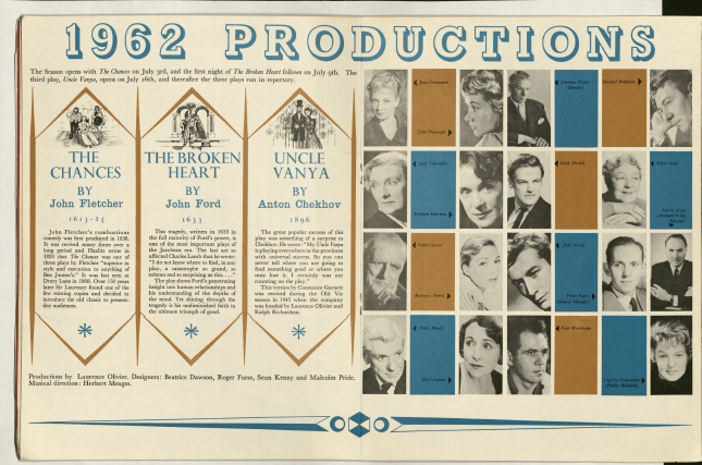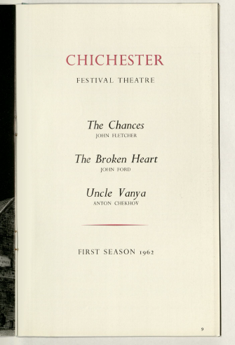 The First Night performance was held on 3 July 1962. Yet, despite all the planning and promotion, reviews and ticket sales of The Broken Heart and The Chances were not quite as favourable as hoped for. However, Uncle Vanya proved to be an absolute hit, and cemented the CFT’s place in British theatre.
