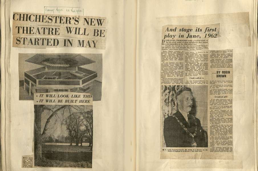 Sixty years ago, in 1962, Chichester’s brand new Festival Theatre opened. Looking rather like a mid-century spaceship, the theatre had come into existence so quickly it may have indeed appeared out of thin air. It was the brainchild of optician Leslie Evershed-Martin, who, in just two years, had planned, funded, built, and promoted this astonishing community landmark. The Chichester Festival Theatre (CFT) archive, held here at West Sussex Record Office, documents the history of the theatre. This blog will look at the two years before the theatre opened.