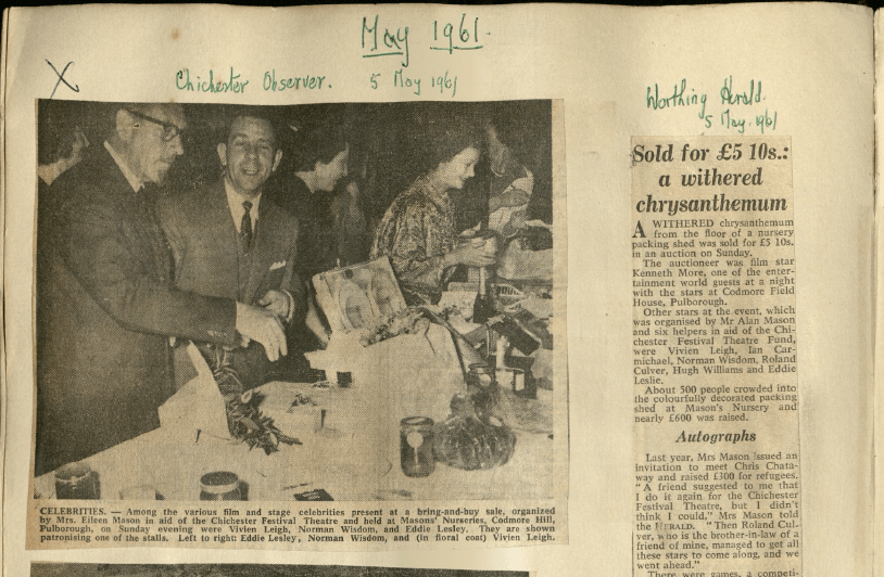 Local and national newspapers were alive with excitement and the latest reports about the development of the CFT. The publicity it garnered attracted attention from the acting stars of the time; in May 1961, Mason Nurseries in Pulborough hosted a bring-and-buy sale attended by the likes of Norman Wisdom, Kenneth More, and Vivien Leigh, all in aid of the theatre fund.