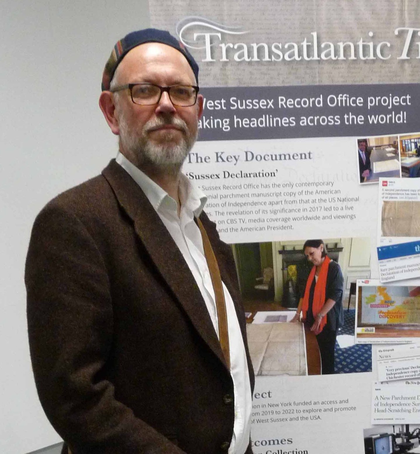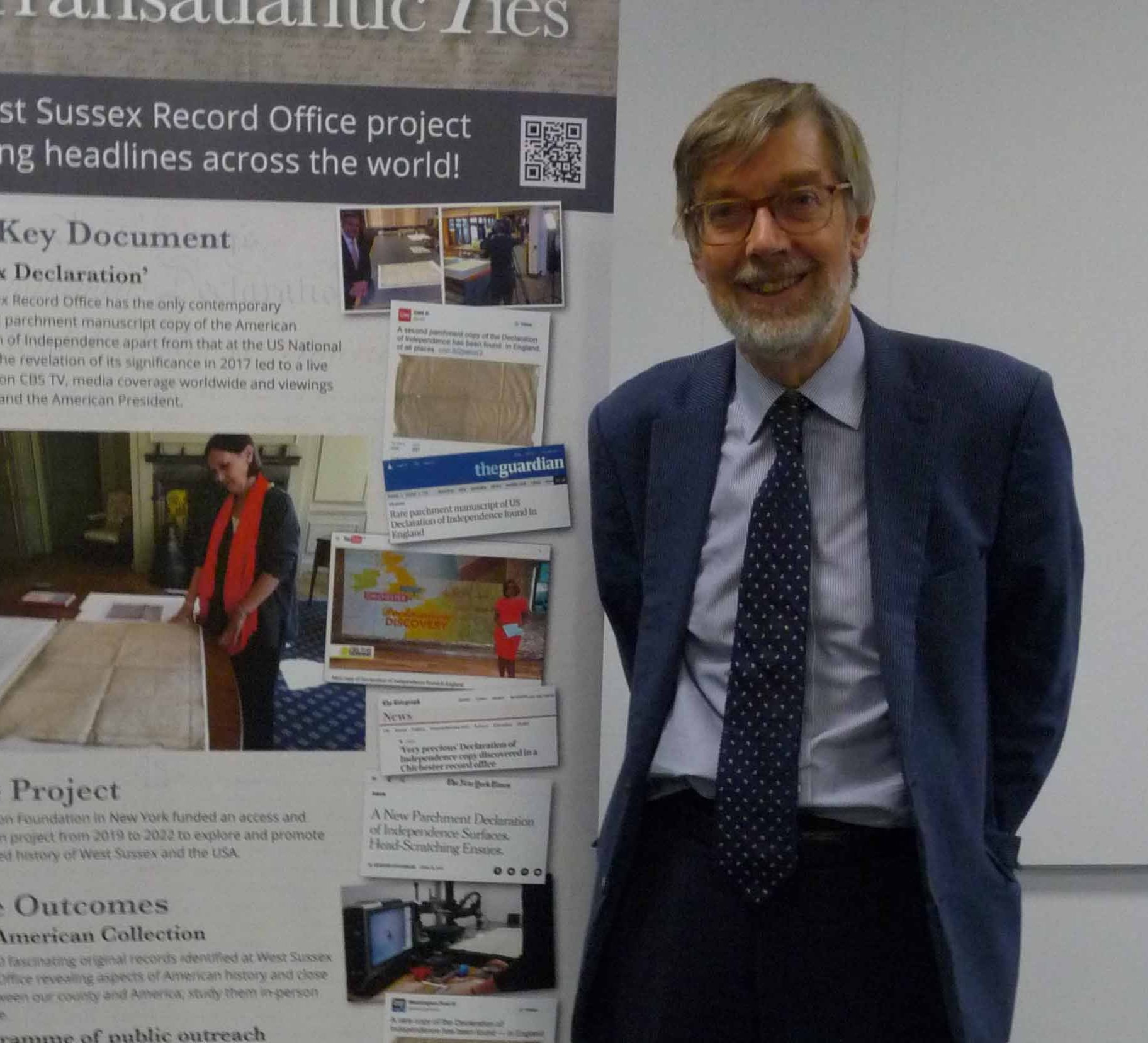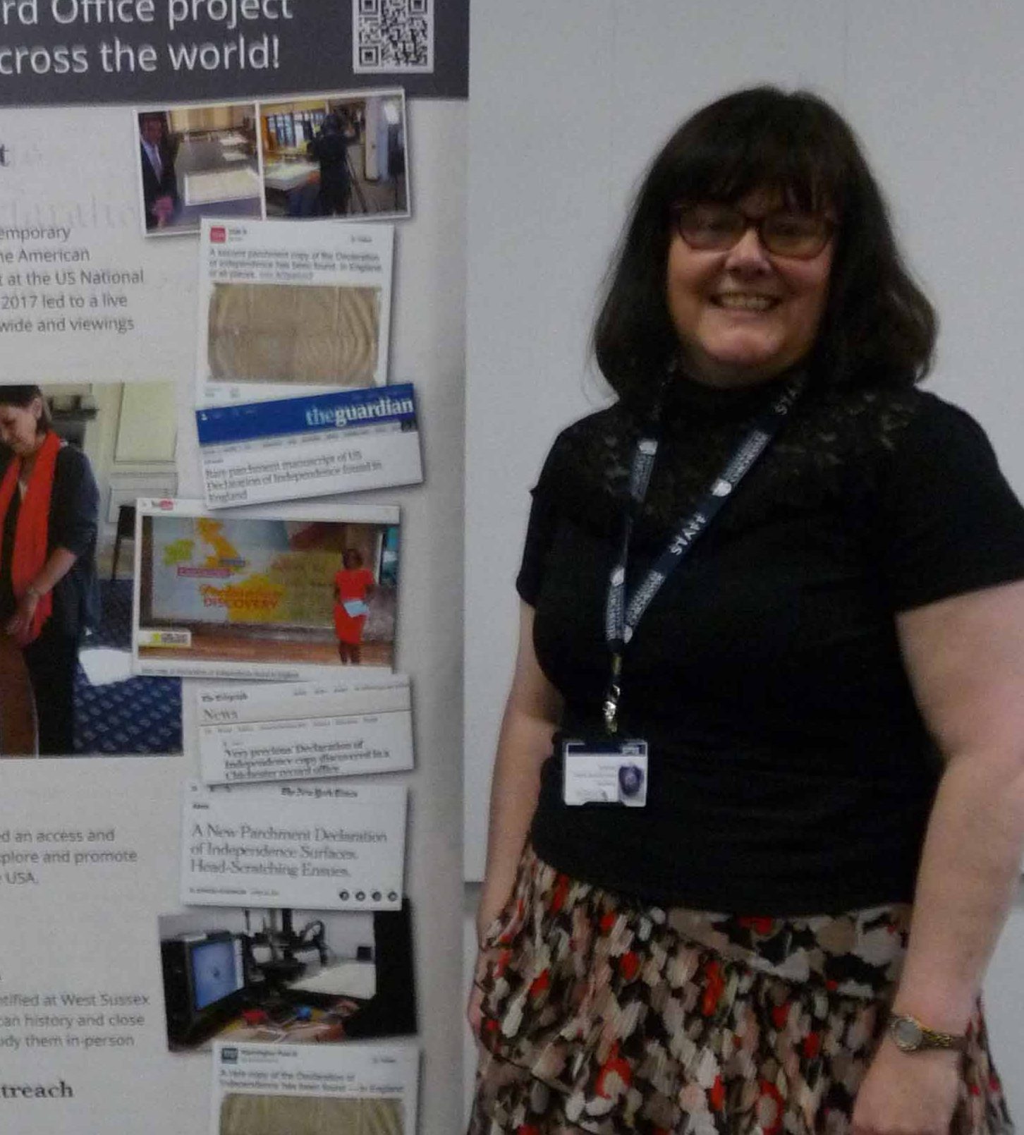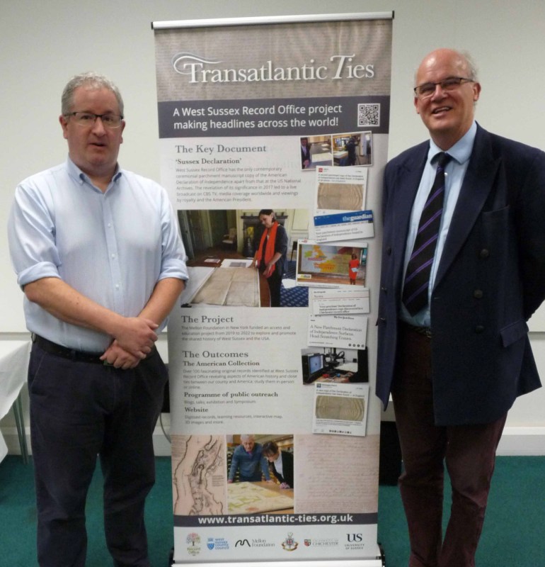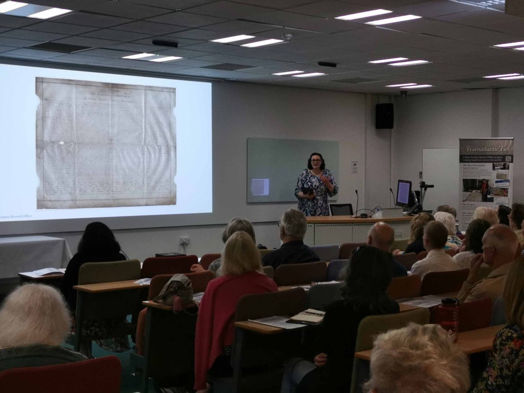 County Archivist Wendy Walker took the audience on a ‘journey’ back to Chichester in 1956, telling the story of how Leslie Holden, an employee of what was then the firm Rapers solicitors, deposited the parchment at West Sussex Record Office alongside a number of other documents likely associated with the Dukes of Richmond. Project Archivist Jo McConville then gave a rundown of some personal highlights and findings during her work on the Transatlantic Ties project.