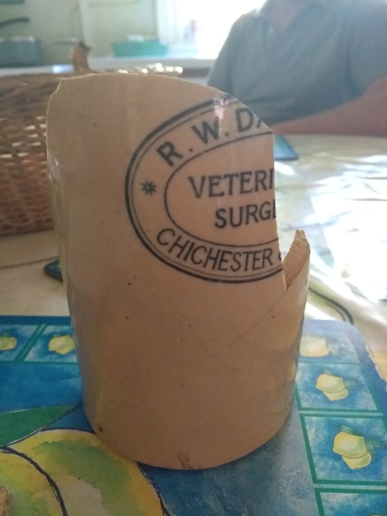 My own interest was piqued when a colleague and I were shown a fragment of a stoneware jar or bottle which bore the partial text ‘R. W. D veter surg, Chichester’. The depositor who showed it to us asked if we could find out anything about this mystery vet and the possible date of the jar.