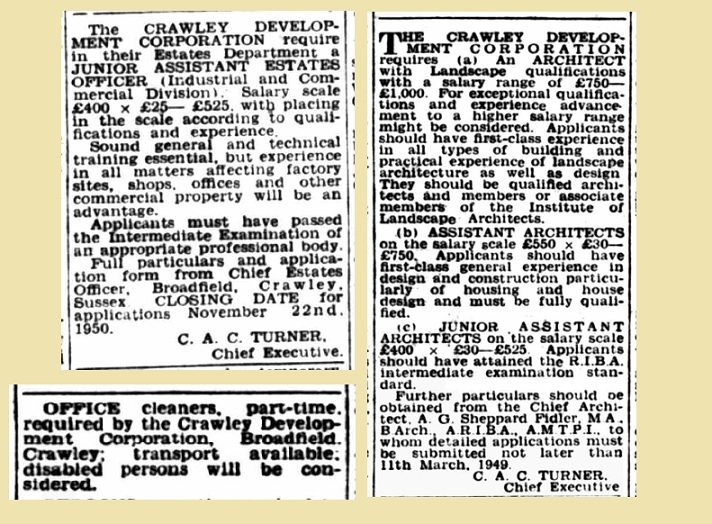 Many of these staff members were hired locally, especially those who worked in the domestic, administrative and estates departments. The Corporation utilised the local newspaper, the Crawley and District Observer, to advertise for vacancies. This is a little surprising given that the Corporation was governed centrally by the Ministry of Town and Country Planning; it would be easier to assume they recruited nationally as many civil service roles are today.