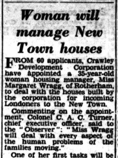 In 1950, the Corporation appointed Miss Margaret Wragg as the New Town housing manager. Margaret was a life long resident Rotherham, Yorkshire. She had previously worked as an assistant housing manager in Rotherham, and had undertaken a qualifications in public housing just prior to the Second World War. Margaret subsequently moved 200-odd miles across the country, for what was hopefully her dream job.