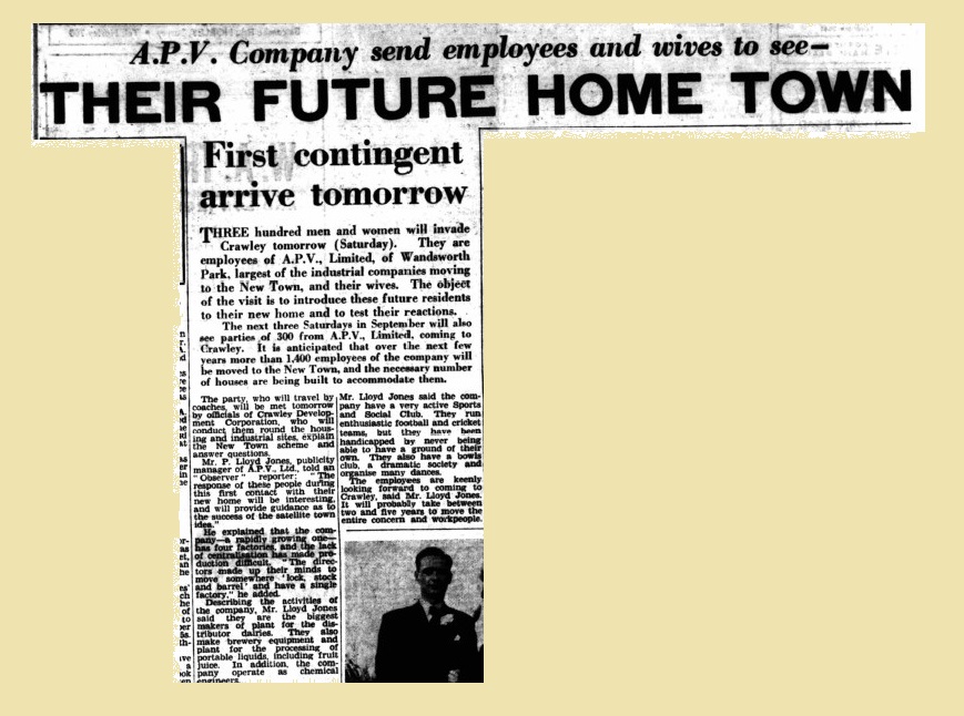 Known as APV, this company supplied (and still does today) equipment used by dairies, breweries, and chemical companies. This was exactly the type of light manufacturing that the Crawley Development Corporation intended for Manor Royal. APV became a significant employer of local Crawley residents, though many of the initial workforce were transferred from Wandsworth – where they were based – to Crawley. In 1950, the Crawley and District Observer reported on multiple visits of their 1400 employees and their families in order to view the New Town and the new homes that would be available to them.