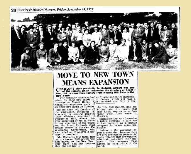 Prior to a visit of 150 Silentbloc employees to view the available housing in Crawley, the Chief Estates Officer Mr Bryan Richards made the trip up to Notting Hill to help convince them of its benefits. High up on the list must have been the potential for contracts generated by Manor Royal’s proximity to Gatwick Airport, which was in the process of being developed. A company manufacturing vibration control products for planes couldn’t be better situated.