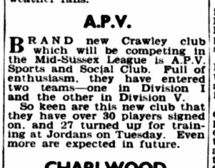 As such a large company, APV took steps to integrate themselves into the community in ways such as with the APV Sports and Social Club. This club was regularly featured in the sports section of the local newspapers. Match reports on the company’s bowling team received several lines, but it was the successes and loses of their football team that received the most attention. Both competed with other teams within the local community long after APV first came to Manor Royal.