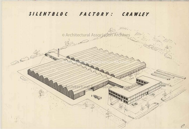 As well as the attraction of housing and an abundance of work for employees, the industrial area was drawing the attention of innovative new architects. Silentbloc had purchased an 11 acre plot for their new factory. In 1955, a fourth year Architectural Association School of Architecture student Douglas P. Cole sketched out his idea for the new factory.