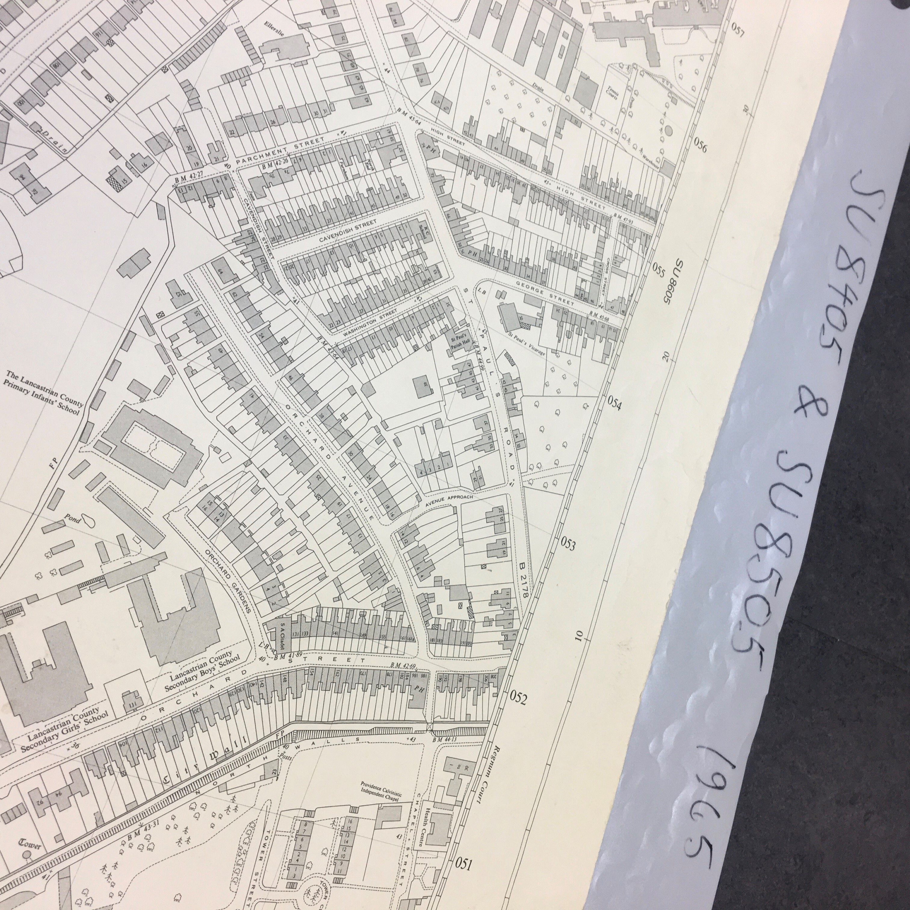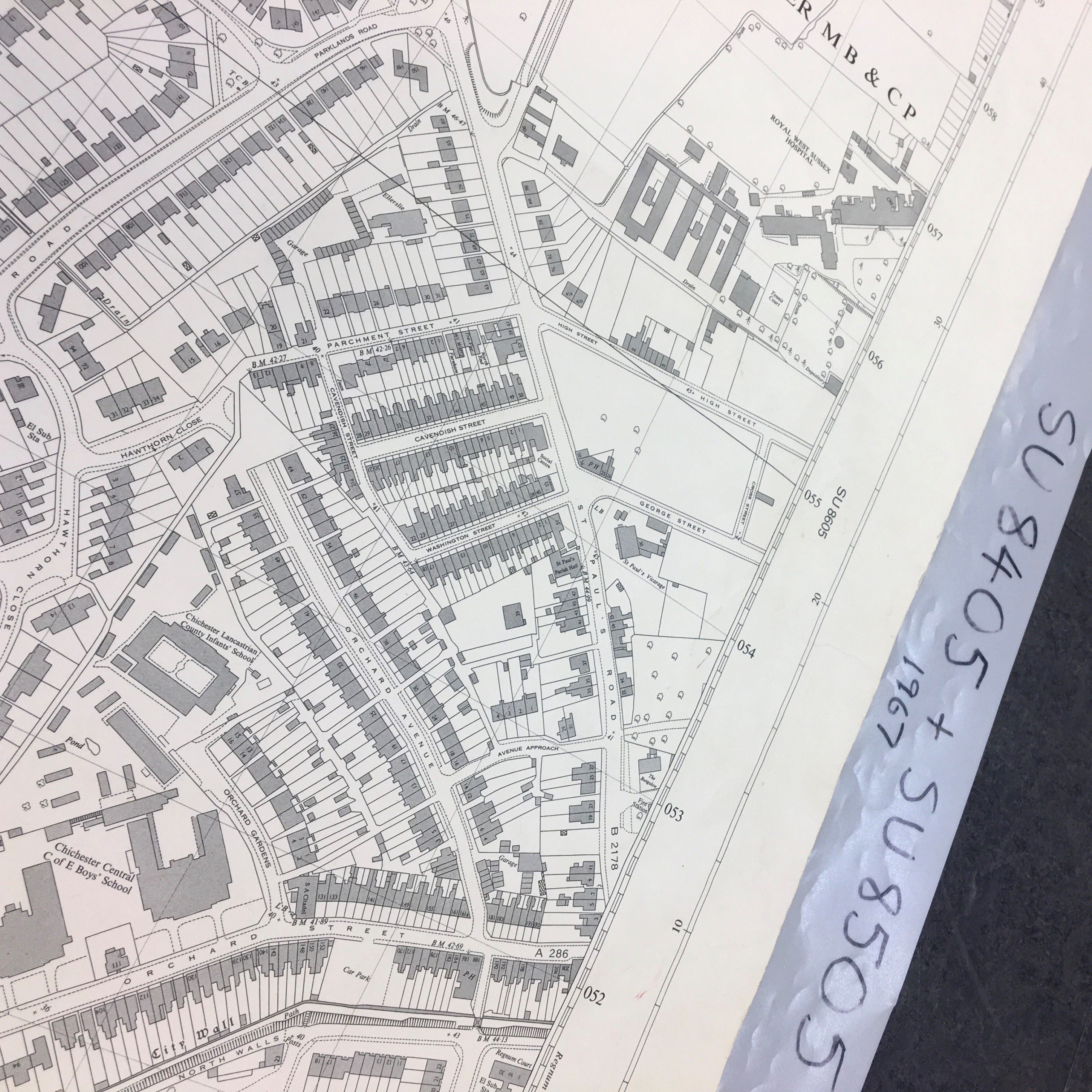 Following our tried-and-true methodology for house histories, it is best to begin with maps as so much can be discovered from these resources. To make this task more manageable it is advised to start with the most recent map available and then trace your way back from there. From the key map I identified that the map reference I would need was SU 8405. This led to the 1967 and 1965 editions OS maps. As you can see below the demolition of Somerstown had taken place between these two maps. You can find out more about Somerstown in our previous blog.