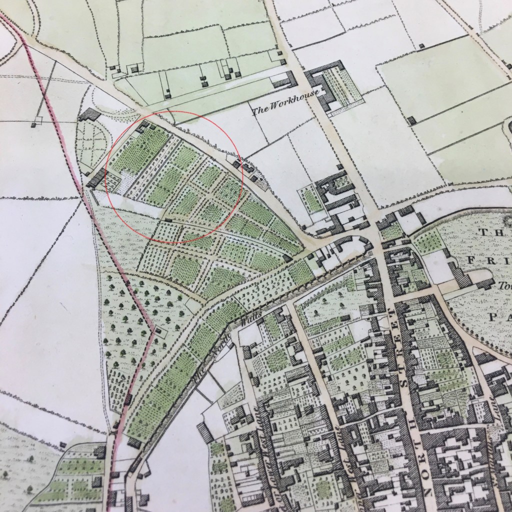 On the other hand, I did check our catalogue to see if we held any other maps that show the land where Cavendish Street now stands before it was developed into housing. Luckily, I was able to find a printed map titled ‘Plan of the Liberties of the City of Chichester by George Loader, Surveyor’ in our collections. This was noted to include the outer perimeter of the city walls of Chichester from 1812. The area that I have circled is a rough guess of where Cavendish Street and the surrounding streets stand today.