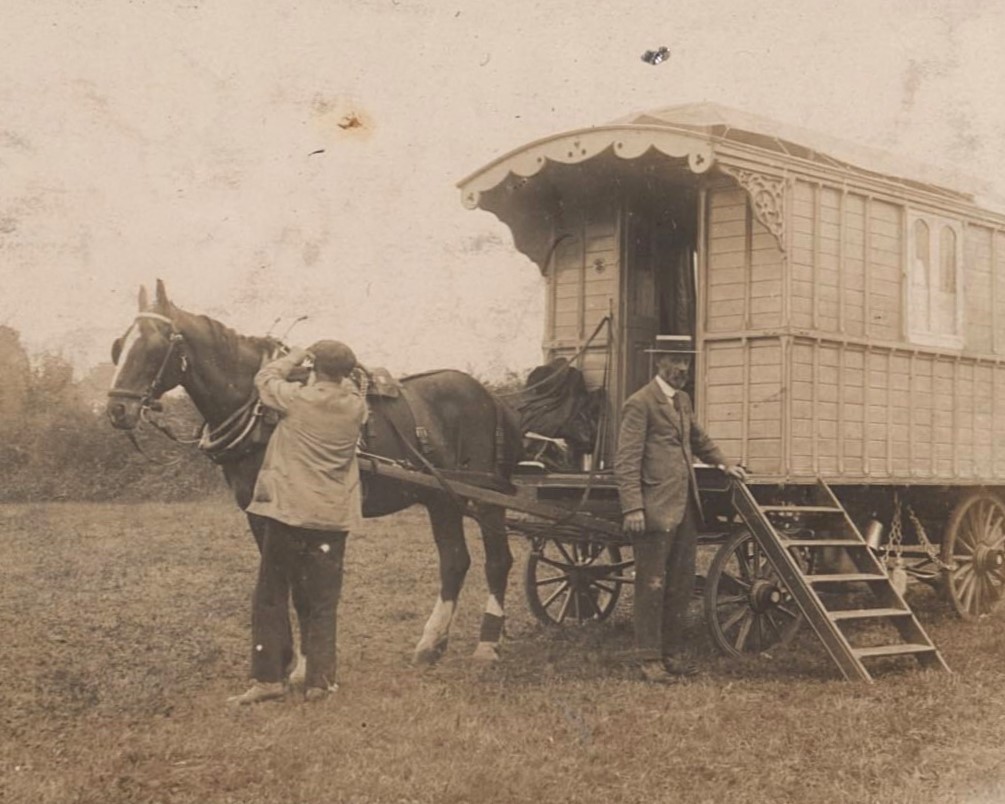 In this blog I will be exploring a caravanning holiday that took place in August of 1915 and how it was documented in such a thorough and descriptive manner. The utilisation of scrapbooking plays a big role in how the father, J C Rands, decided to immortalise his family’s holiday. Additionally, Rands built the caravan by hand and the attention to detail of the finishing leap through the page; painted yellow and red, the windows were adorned with white lace curtains, and the brass work was glistening.