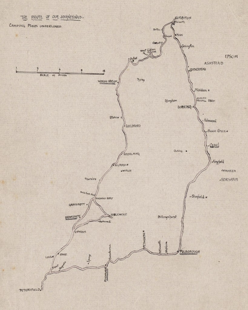 This holiday took the family through three counties over two weeks: Surrey, Sussex, and Hampshire. Starting from their hometown of Surbiton the family and their coachman (affectionately referred to as ‘Buff’ (as in Buffalo Bill)) they set off with curious eyes from their neighbourhood. As you can see from the map below the route was very well planned and camping spots were already organised beforehand.