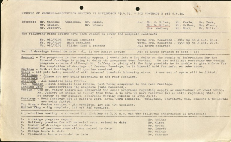 The collection focuses on projects the company was involved in. Starting with a series of correspondence, you can follow a path of product development through written discussion, both internally and externally with commercial partners. The company papers include minutes of meetings, including working with producers of the 1966 war film: The Blue Max. Design work is contained within project files; with particular focus on innovative jet and prop aircraft prototypes. Here, photographs, plans and specifications can be found of numerous design concepts. The researcher can also see company publicity papers, promoting Miles products (such as flight simulators), and ‘Milestones’ newsletters for employees. Finally, a series of photographs show many of the company activities, including sales pitches, visitors, views of aircraft and testing equipment.