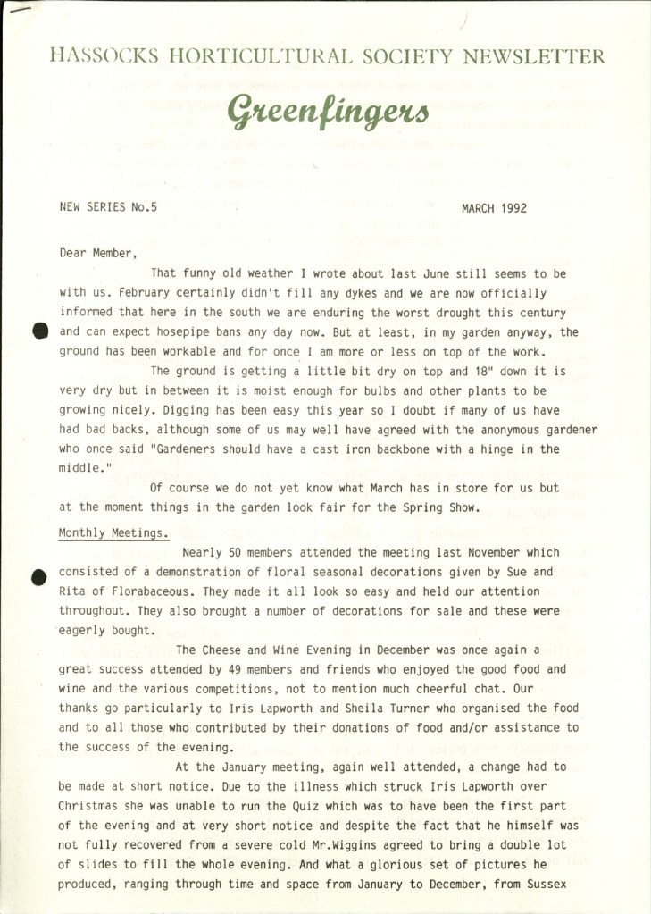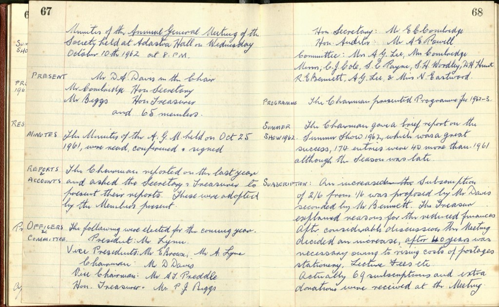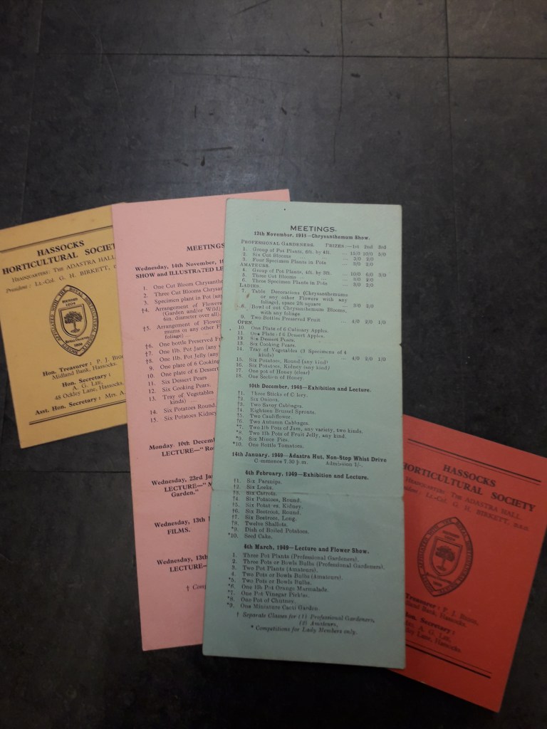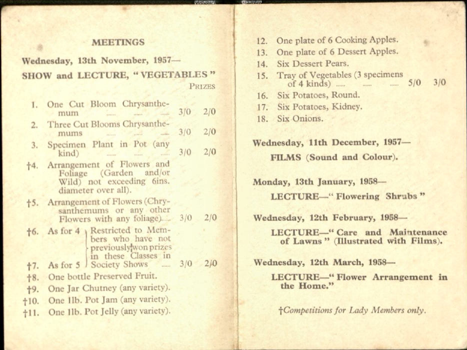 The collection begins with neatly hand-written minutes of its committee, showing the daily administration of its membership, reports, accounts, organisation of regular visits/lectures and demonstrations. The members themselves are kept well informed of the Society activities via its newsletter, ‘Greenfingers’, of which a select range exists from 1969 to 2017. Membership cards, with the earliest example from 1948, include printed activity programmes, featuring lectures, films and competitions. Finally, a miscellaneous series of items reflects the other activities society members engaged with; including newspaper articles publicising the organisations activities and exhibitions, summer show posters and invites to celebration dinners.