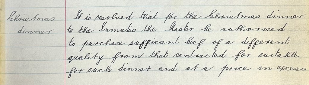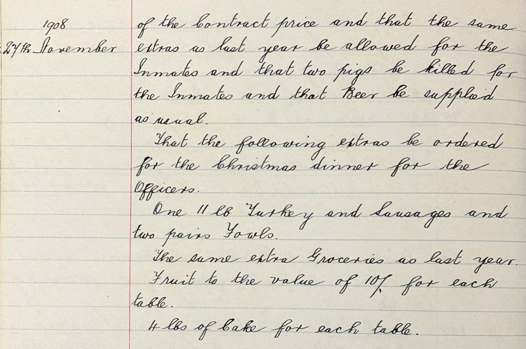 The hot Christmas dinner for seventy inmates was served at one o’clock and it was not the usual affair of gruel or stewed mutton. Rather it was made up of “roast beef, roast pork, roast and boiled potatoes, carrots, parsnips and Yorkshire pudding.” And of course, no Christmas dinner is complete without a Christmas pudding! Beer was also served to the inmates which was quite a special treat. Looking to the Board of Guardians minute book that covers Jun 1908-Mar 1910, you can see how the dinner was thoroughly planned for.
