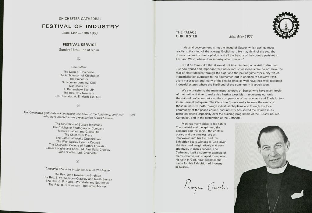 Held at Chichester Cathedral between the 14th and 18th June 1968, the Festival of Industry was envisaged as a showcase for the variety of manufacturing across Sussex and a demonstration of what can be achieved through skilled craftsmanship. It was an unusual joint partnership, a coordinated event organised by the Diocese of Chichester, trade unions, the Federation of Sussex Industries, West Sussex County Council and manufacturing companies.