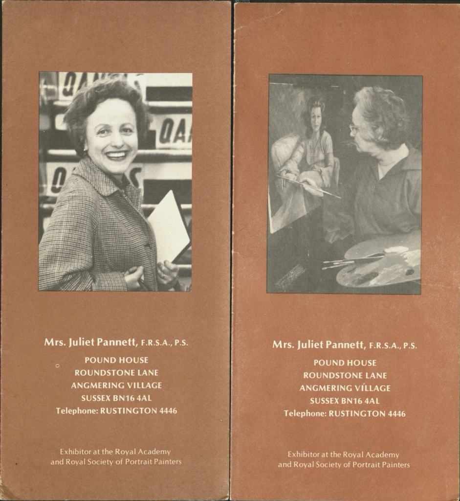 Juliet Pannett was an English portrait painter, born in Hove on 15th July 1911. Educated and trained at the Brighton College of Art, her first commission was for the Sussex County Magazine, drawing craftsmen, shepherds and fishermen. She and her family moved to Angmering in 1964. Over the coming years, one thousand people from all walks of life sat for Juliet Pannett to paint their portraits. Sitters included leading figures in British society from the mid to late twentieth century such as Queen Elizabeth II, other members of the Royal Family, several Prime Ministers and well known military officers, musicians and athletes. She was the sister of Phoebe Somers, a well-known Sussex professional lecturer and illustrator. Juliet died on 22nd August 2005.