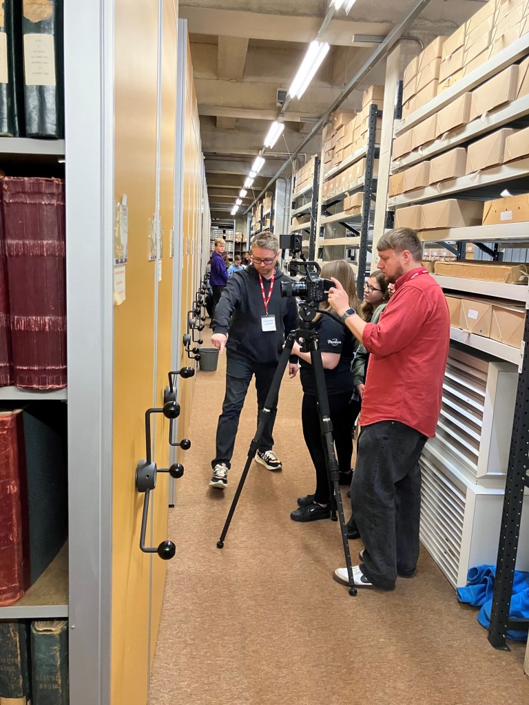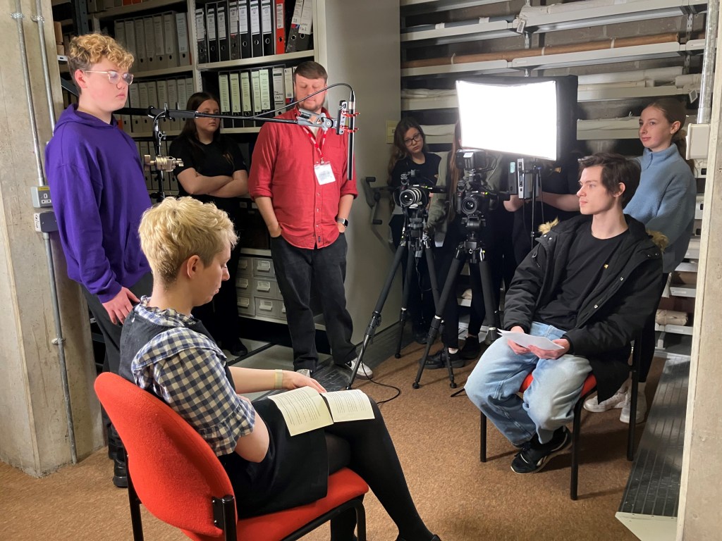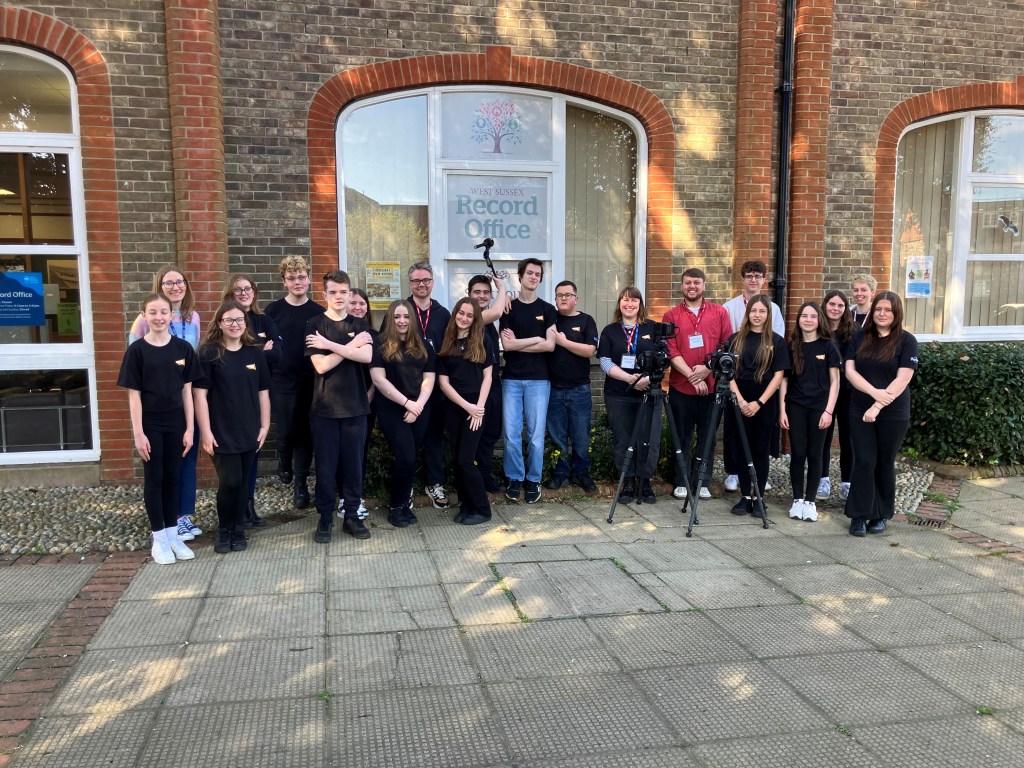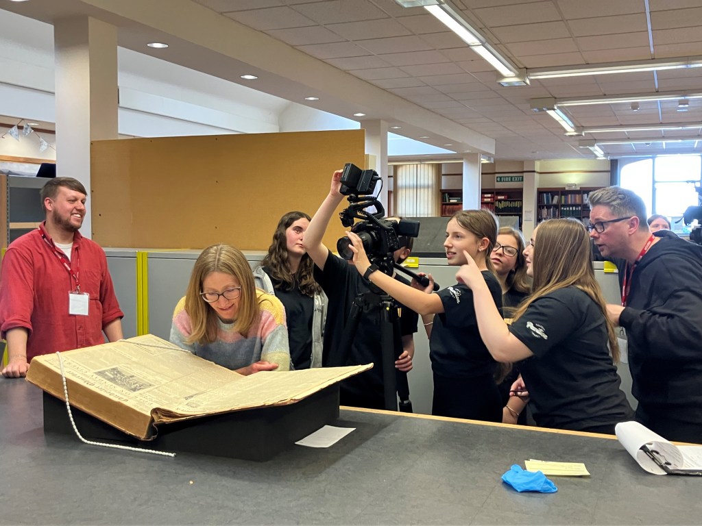 Following on from their initial visit, the students invited us to take part in their documentary and, on 31st March, the group returned to WSRO – this time, with large numbers of cameras, lights and microphones! The students led every aspect of the day, from scheduling to recording, writing questions and choosing which documents to feature. They were particularly interested in highlighting the town’s connection to the British Union of Fascists movement in the 1930s, and featured documents from our collections which provide evidence of this.