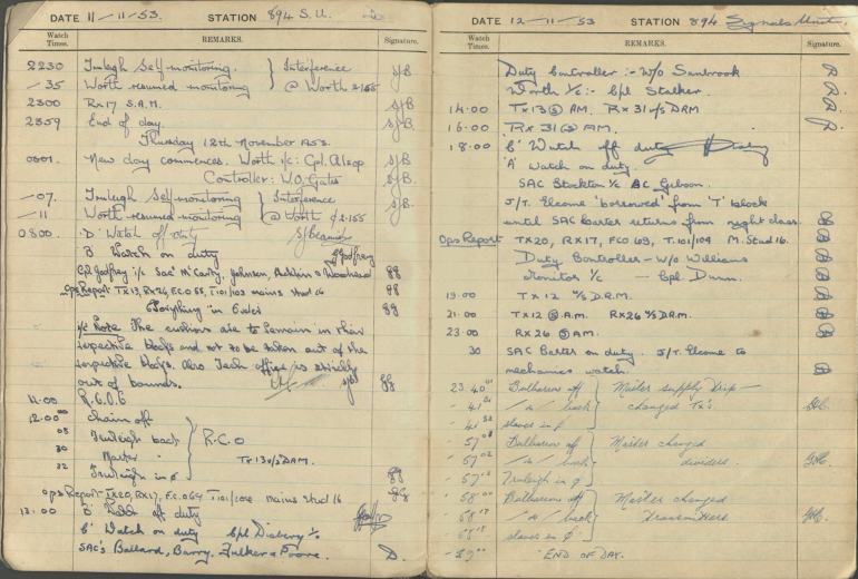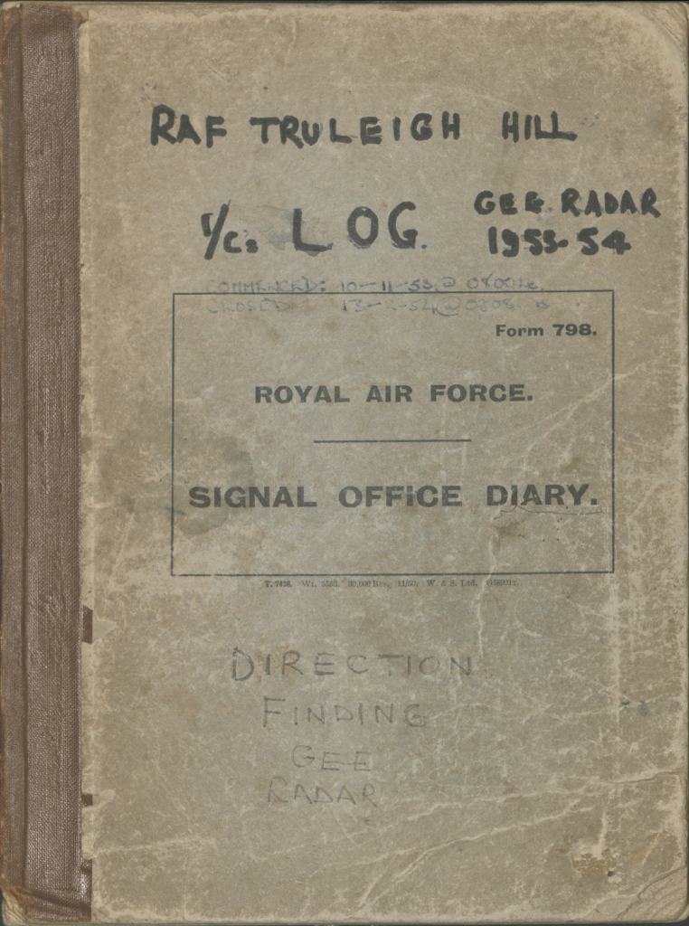 This collection comprises one item: an RAF Signal Office Diary, with entries dated 10th November 1953 to 13th February 1954. It is a record of everyday operations of the station it served, an environment where communication of accurate information was vital. Within the volume, each page is headed by the date and station number, and then split into three columns. The first denotes the duty (Watch) times. The second, ‘Remarks’ includes notes by those on duty or ‘watch’, when the station was active or in-active (interference and shutdowns were part of the routine) and information about the activities of neighbouring stations. The third contains the initials of those making the remarks. Entries are sporadic, sometimes made every hour, or within minutes of each other. Over the course of day, many contributors added to this volume. It reflects an extremely busy, alert environment, but with the underlying tension of always having to watch the skies.