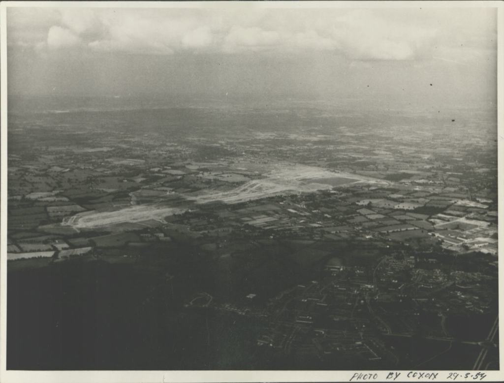 This photograph is an aerial view taken from the south. It shows construction around the airfield during 29th May 1957. Visible are the taxiways and runway, surrounded by a patchwork of fields and smaller settlements. To the south are the suburbs of north Crawley and what was left of the settlement of Gatwick itself. To the east can be seen the London to Brighton railway line, providing main access to the airport. Overall, the image shows a stark contrast to the modern day terminals and M23 link road, later 20th century additions. The photograph highlights the openness and space of the site, ideal for the up-and-coming jet age.