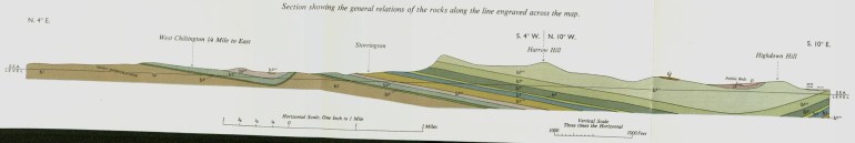 AM 1858 is described as sheet number 317, Drift edition and consists of a single, folded sheet. Printed upon it is an introductory description, index, section and colour scaled map. Most of the item is taken up by the drift map, depicting distribution of sediments like glacial, fluvial and marine deposits, on a scale of one inch to one mile. A kaleidoscope of bright vivid colours, it shows what is hidden just below the surface of the ground. The area covered stretches from the coastal plain to the South Downs. Chichester is in the southwest corner, with the Arun River Valley to the east and South Downs to the north. An index, to the right, notes the different types of deposits found on the map and their relative. Below the map is a section; a traverse of the lower coastal plain on the left to the higher ground of the South Downs on the right. For ease of surface reference, the locations of West Chiltington and Highdown Hill are marked. Overall, it is an item which gives us a very different view of West Sussex.