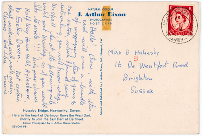 The archive shows us that both Tommie and Betty were fond of trips, domestic and overseas. There are several postcards addressed to them from holidaying friends. And, though there is a marked lack of correspondence between the two women in this collection, there is one postcard sent from Tommie to Betty in 1959 from Devon –