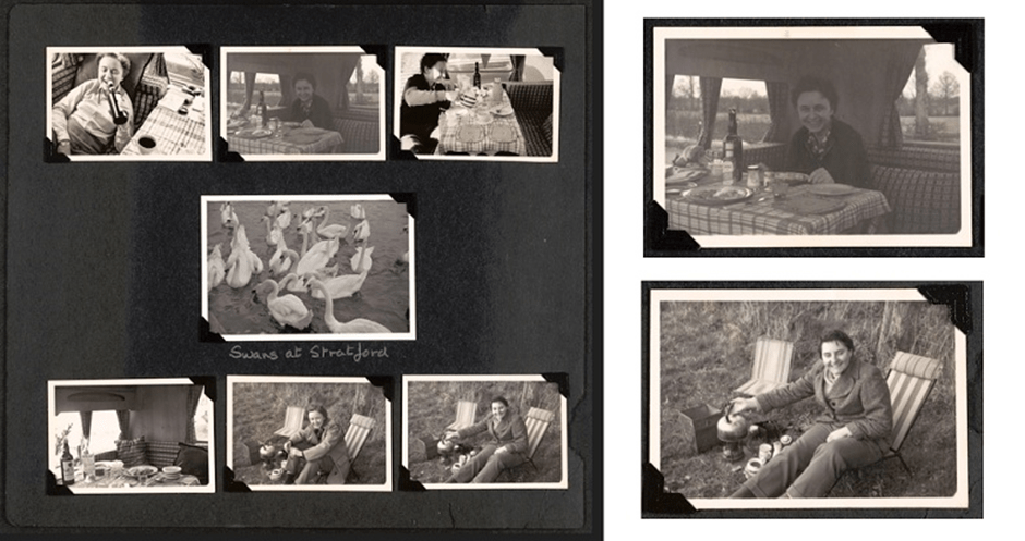 There are albums of holiday snaps, too. Here is a page showing several photos of Tommie and Betty thoroughly enjoying a caravan trip in Stratford. I love the small details in these images; the salmon and new potatoes for dinner, the handsomely dressed dinner table, and the tea paraphernalia set up outdoors in the cold!
