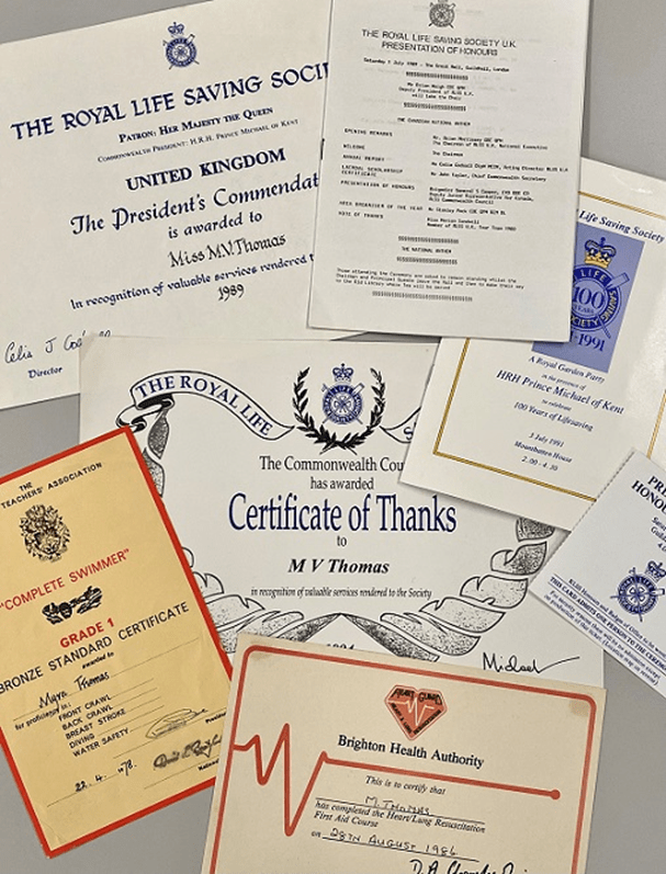 As if service in the military wasn’t enough, both women were also exceptionally active members of the Royal Life Saving Society (RLSS) from the 1970s right up to their deaths in 1996 (Tommie) and 2018 (Betty). Their archive includes various awards and certifications completed in connection with their life saving activities. These include a Certificate of Thanks awarded to Tommie in 1994 by the Commonwealth Council of The Royal Life Saving Society in recognition of her service. And, in honour of Betty’s contributions, the Sussex branch of the RLSS has established the Betty Hakesley Award.