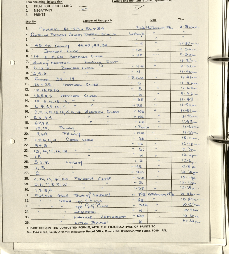 It was this year the CoE designated as European Architectural Heritage Year (EAHY). In the UK, a central committee was established to encourage and awaken interest in architectural heritage through a series of conservation and improvement projects. The challenge was taken up by West Sussex Record Office (WSRO) as an opportunity to use the help of the local community and conduct a photographic survey of towns and villages across the county. The idea was for the survey to provide a unique snapshot of the county and was particularly timely as just the previous year, 1974, West Sussex had been established as a ceremonial county. The project would take advantage of the fact that many people had 35mm film cameras. An impressive 102 groups/individuals offered to participate, and surveys were promised across 101 communities.