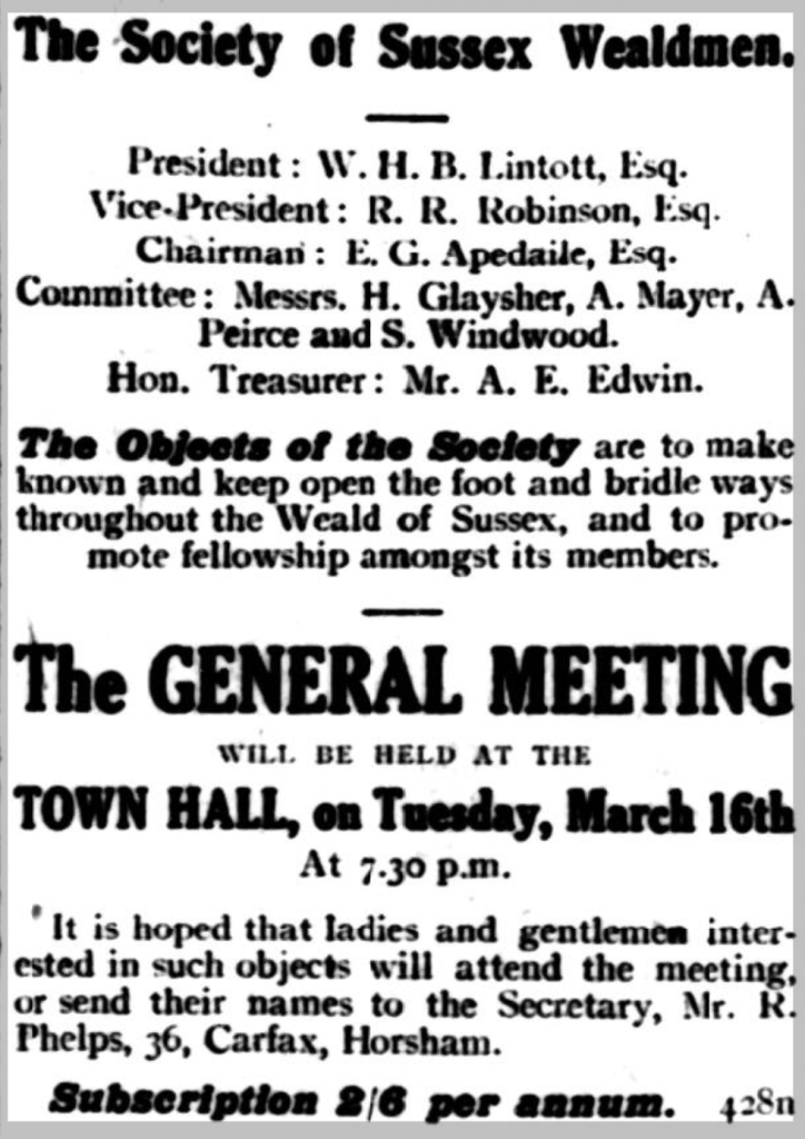 The society was launched at a public meeting held in Horsham Town Hall on Tuesday 16th of March 1926. The aim of setting up this society was twofold: to popularise walking as a hobby as well as the preservation of bridleways and footpaths which can easily be lost if not maintained, recorded and mapped out thoroughly. Then the first official walk by the society was held on Sunday 28th of March 1926 and it began at Cranleigh, and 12 miles later ended in Shere, of which 21 members were present.