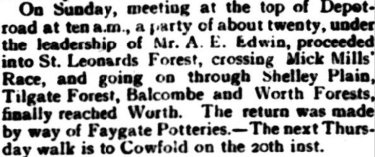 As can be gathered from above, the walks were not limited to the Weald only but spread across into the Downs too. In the April 1926 committee meeting it was agreed that a ratio of two walks in the Weald and one on the Downs for the Sunday walks.